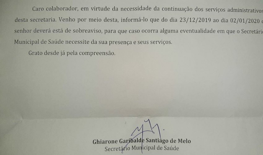 PAULO AFONSO – Até onde se tem notícia, é a primeira vez que isto ocorre. No comunicado enviado aos funcionários da Secretaria de Saúde, hoje 24, o secretário Ghiarone Garibaldi convoca a todos para ficarem de “sobreaviso” à disposição dele “caso ocorra alguma eventualidade”.